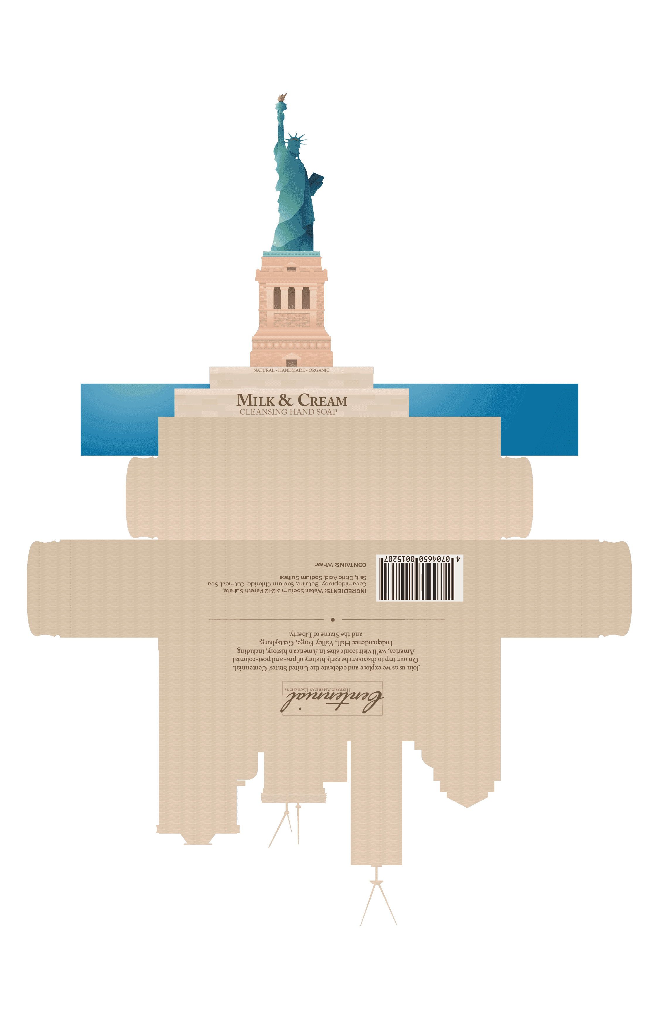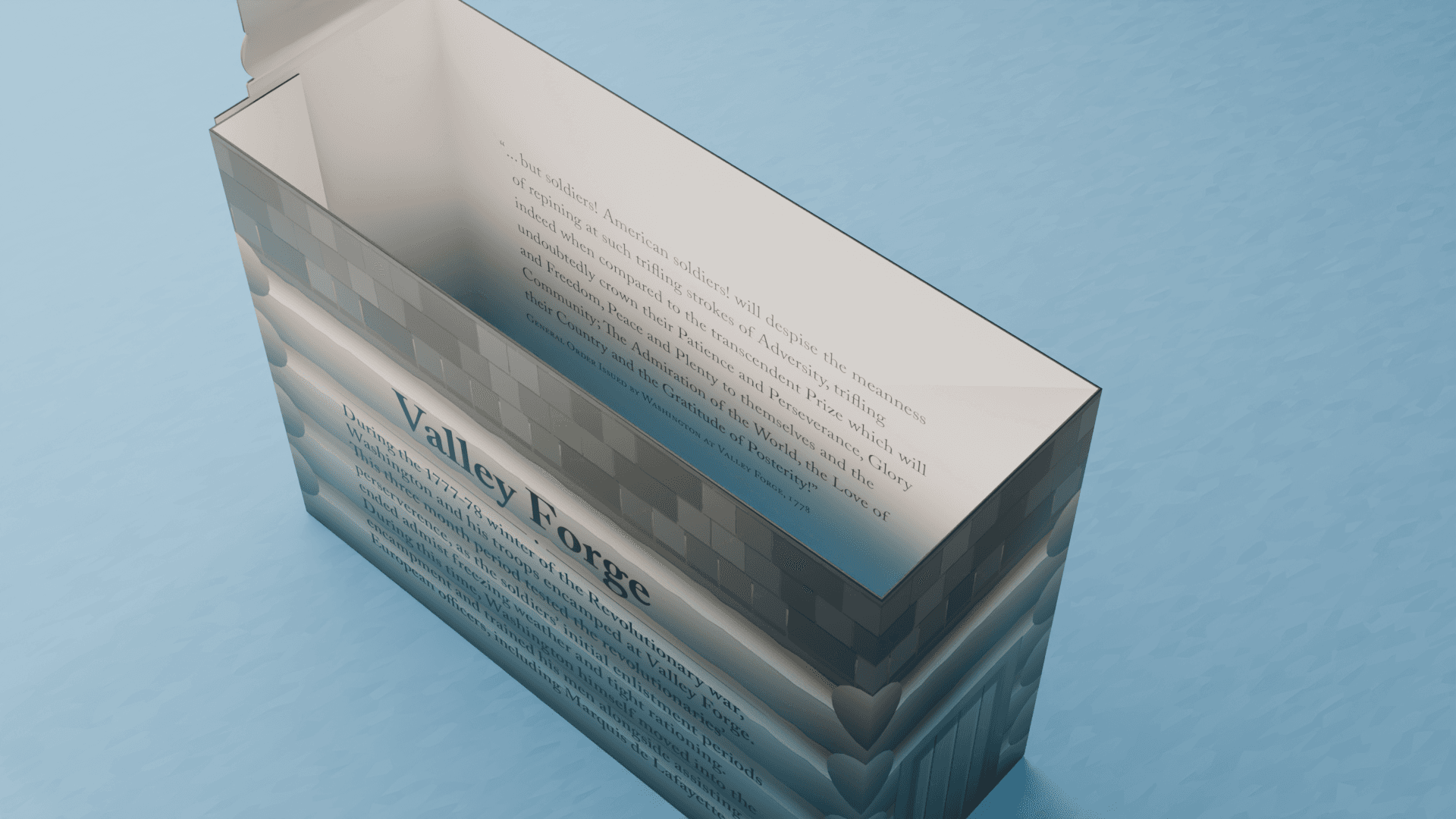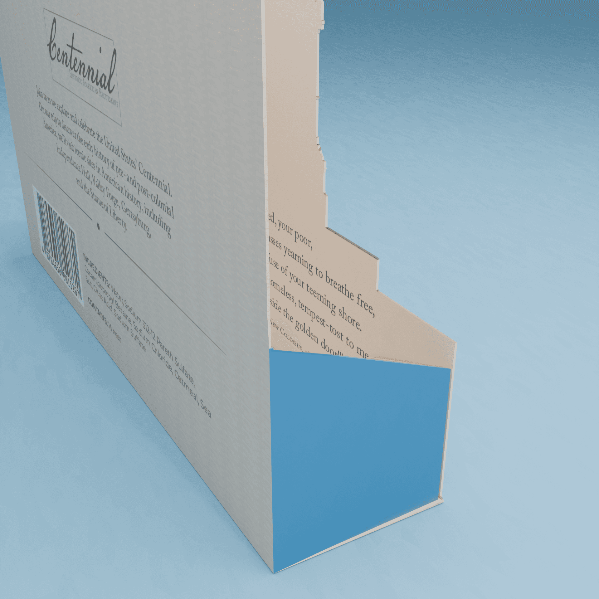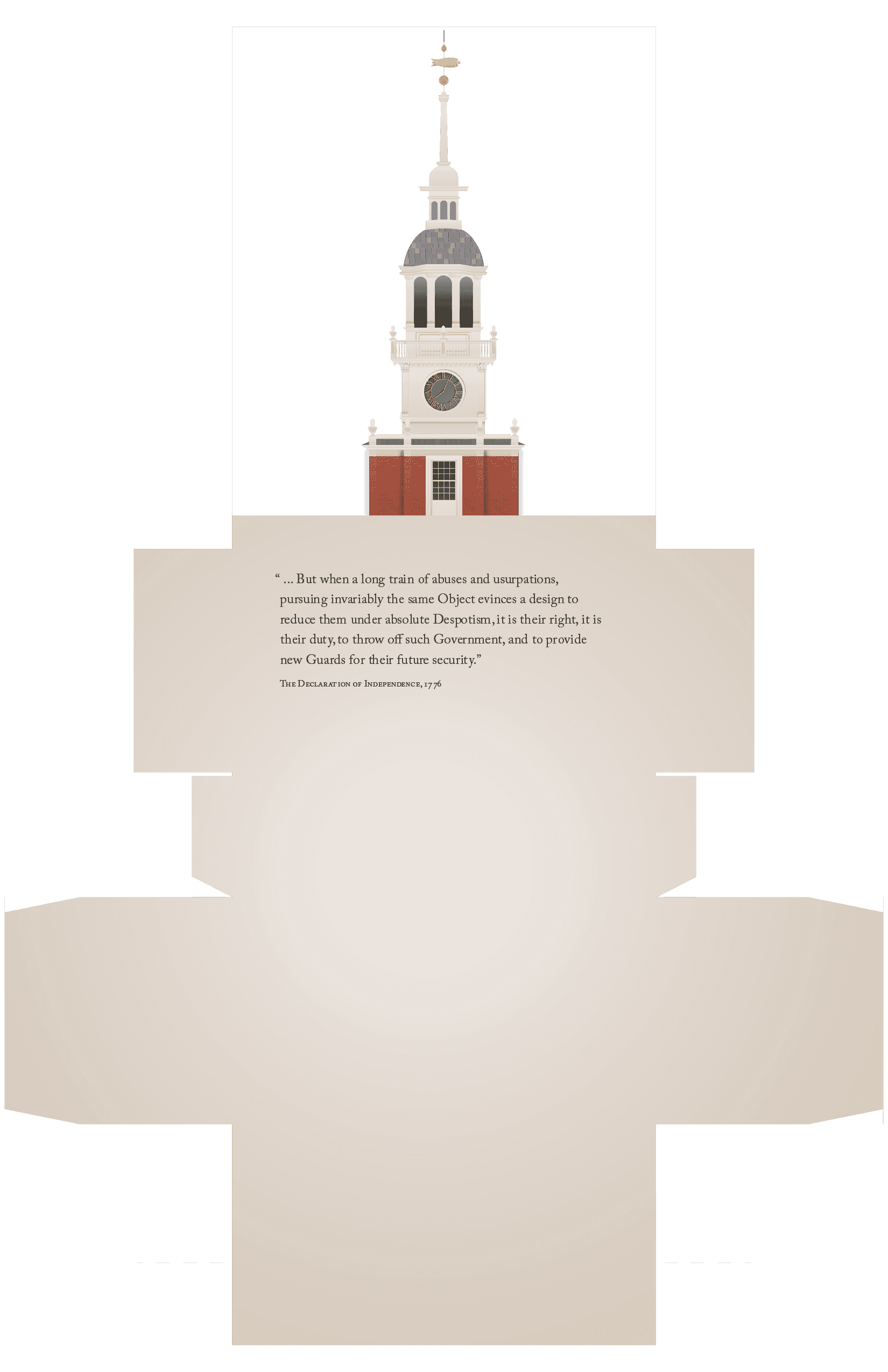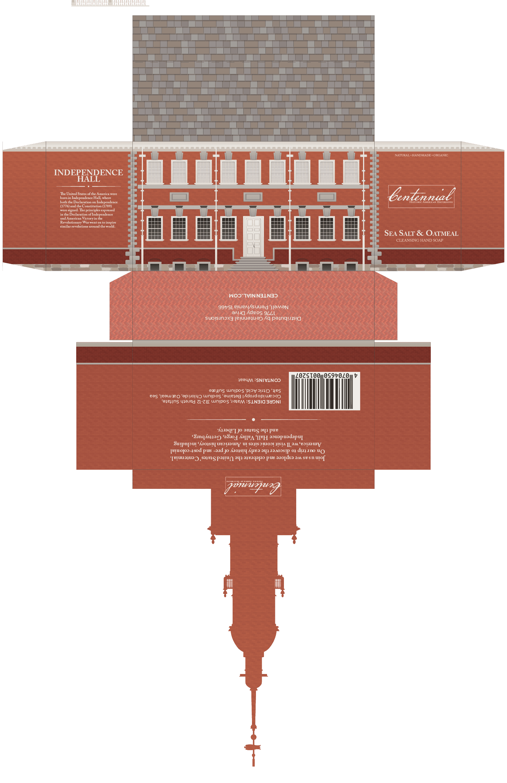Centennial is a week-long excursion from Independence Hall in Philadelphia to the Statue of Liberty in New York, showcasing the early history of the nation. This trip is bookened by the birth of nation in Philadelphia and a celebration of its centennial in New York. The final project transformed famous buildings and sculptures into boxes, which would be given to guests at the relevent locations. The exterior of each box features the architecture, while the interior hides a relevant quote related to the location.