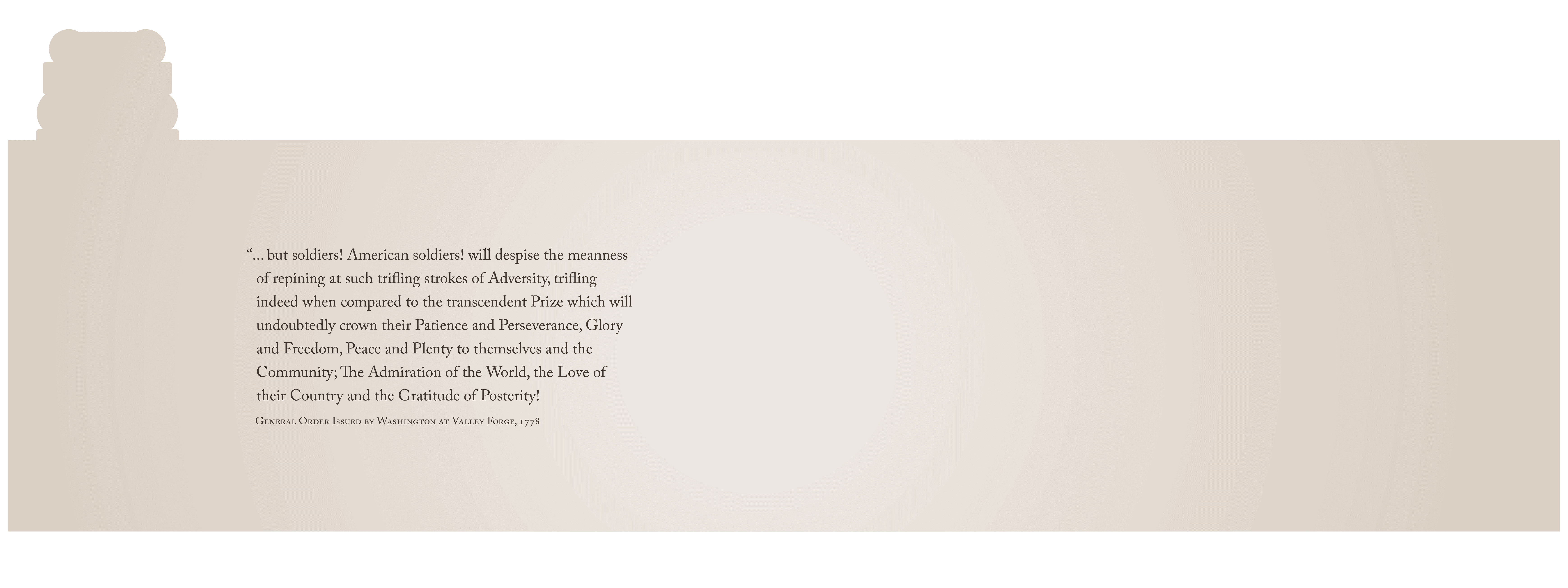 “... but soldiers! American soldiers! will despise the meanness of repining at such trifling strokes of Adversity, trifling indeed when compared to the transcendent Prize which will undoubtedly crown their Patience and Perseverance, Glory and Freedom, Peace and Plenty to themselves and the Community; The Admiration of the World, the Love of their Country and the Gratitude of Posterity!”