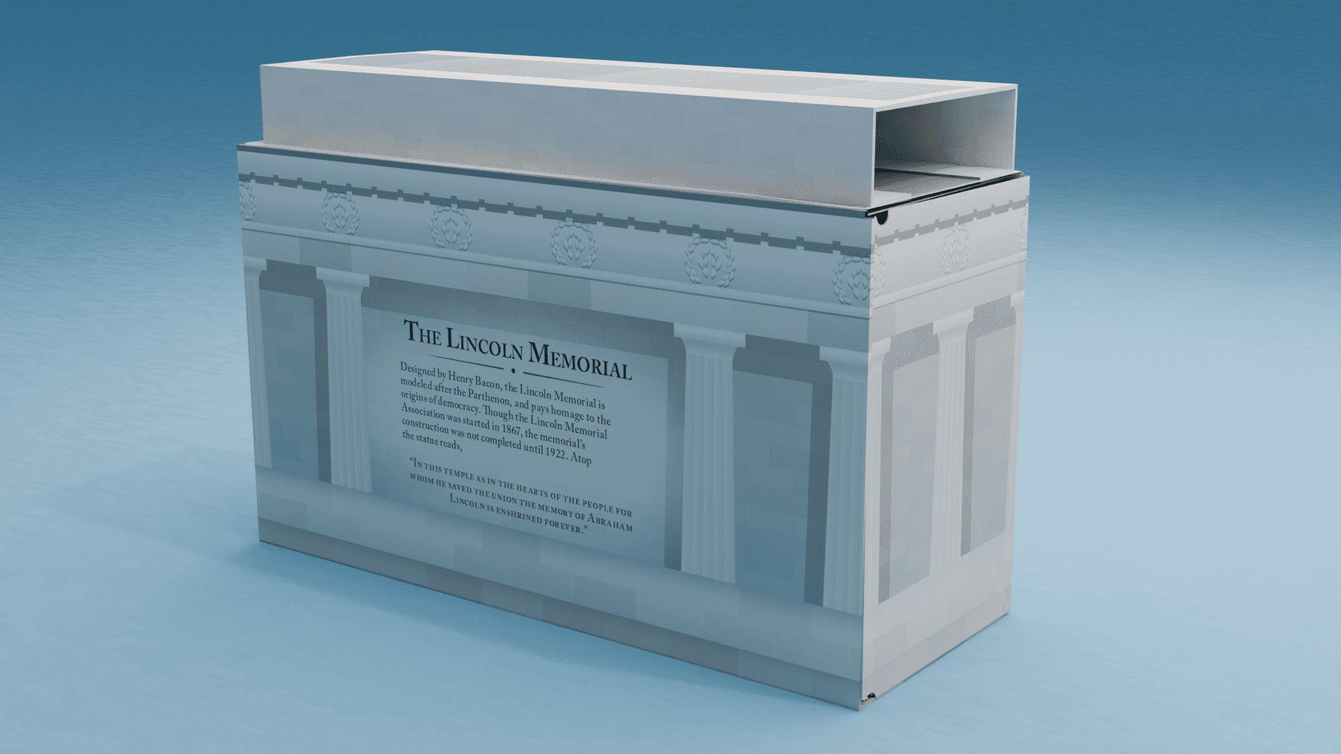 Designed by Henry Bacon, the Lincoln Memorial is modeled after the Parthenon, and pays homage to the origins of democracy. Though the Lincoln Memorial Association was started in 1867, the memorial’s construction was not completed until 1922. Atop the statue reads, “In this temple as in the hearts of the people for whom he saved the union the memory of Abraham Lincoln is enshrined forever.”