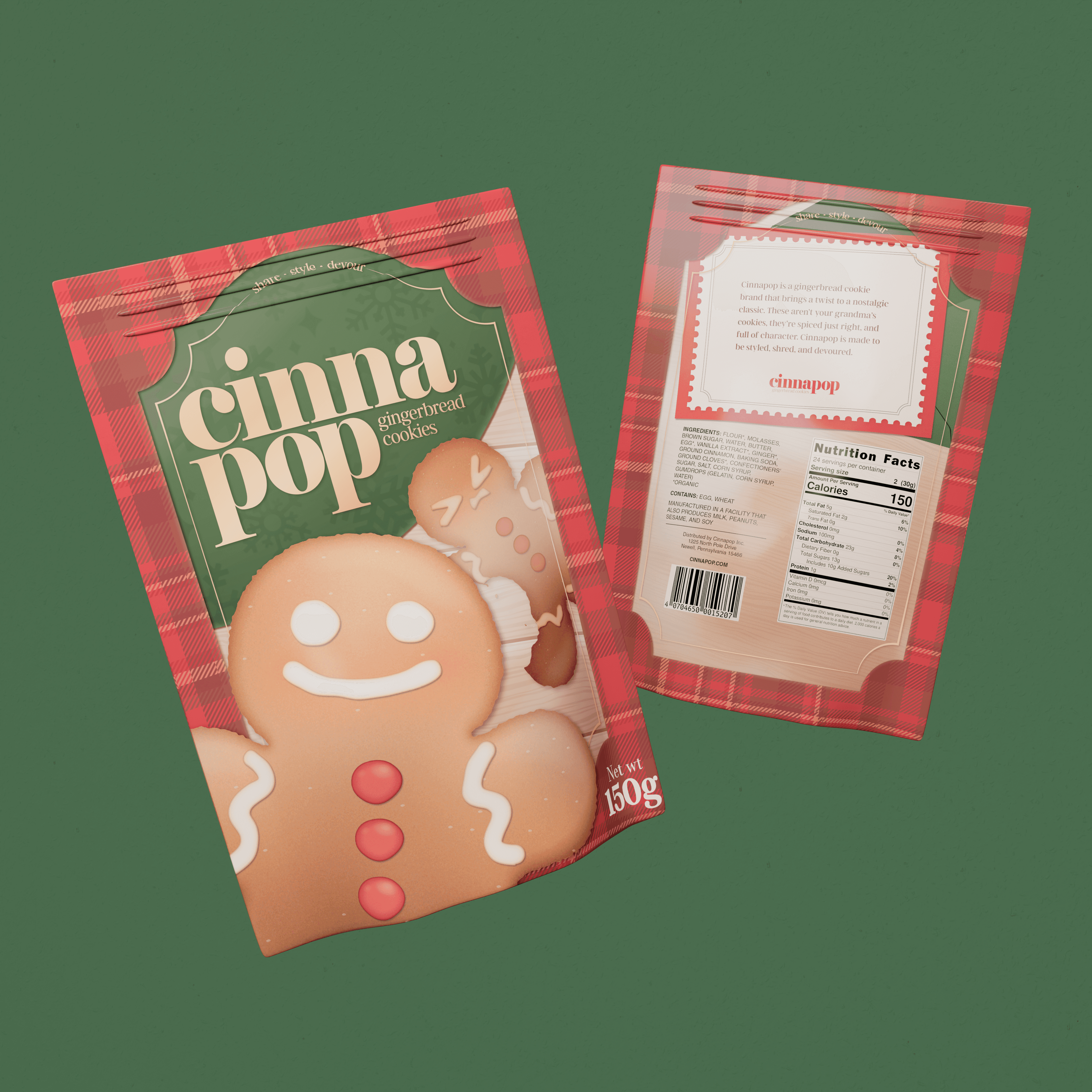 Concept packaging for Cinnapop, a modern twist on your grandma's gingerbread cookies. This packaging was designed to look both classic and playful, with luxurious accents. The mockups were modelled from scratch and rendered out of Blender. The accompanying motion graphic borrows elements from the packaging design to create a fun, lively animation.